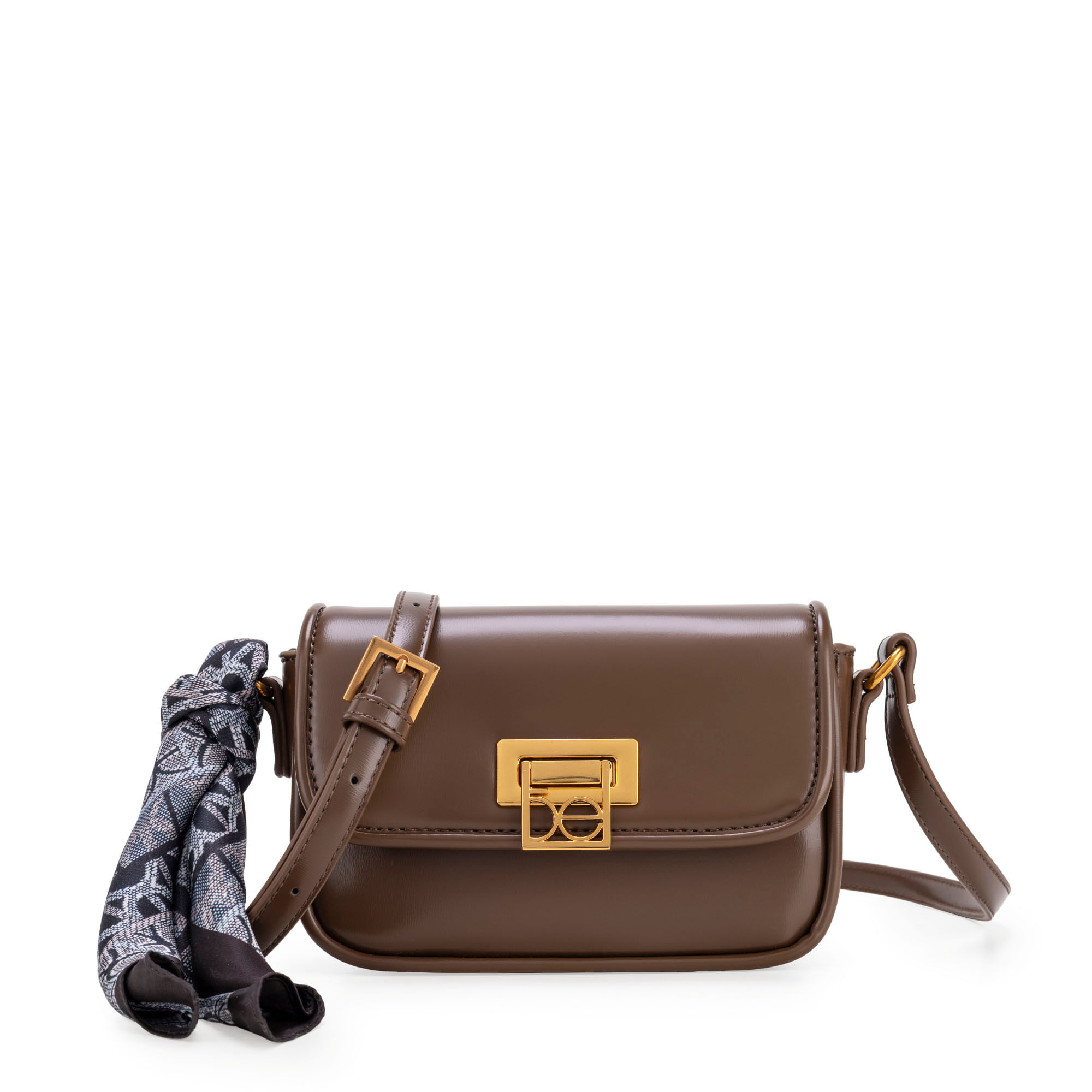 Bolso Crossbody hecha con material vegano apariencia piel. Cuenta con solapa con broche metálico con detalle de monograma. Incluye mascada multiusos desprendible. Asa larga ajustable.