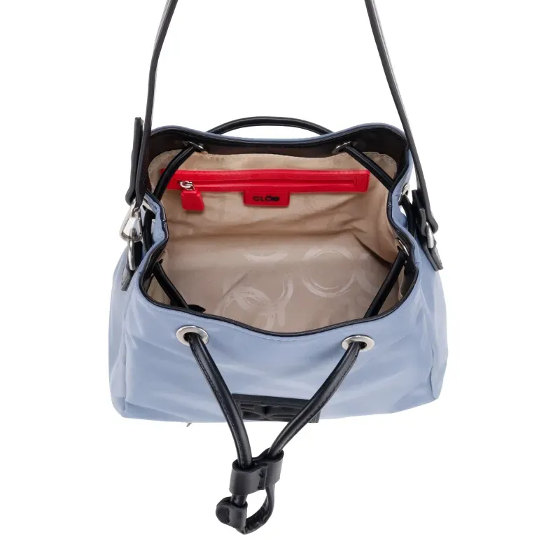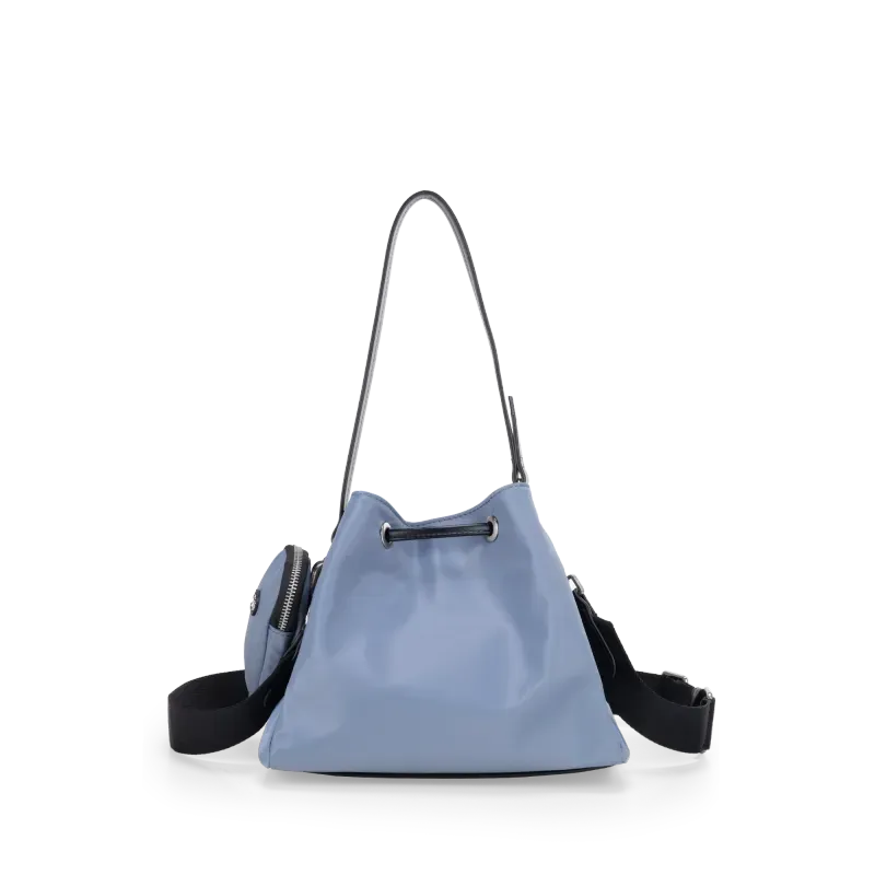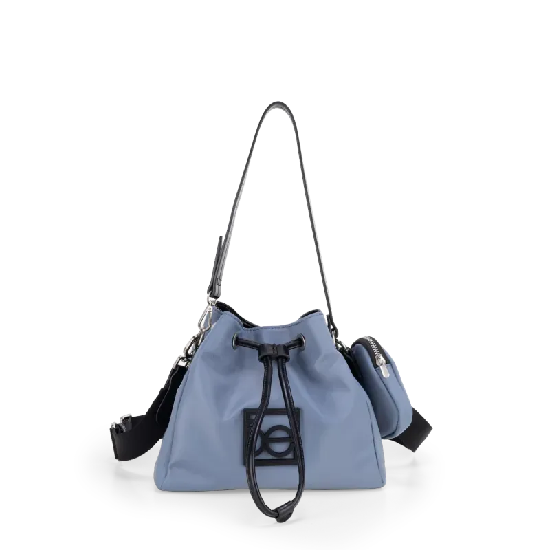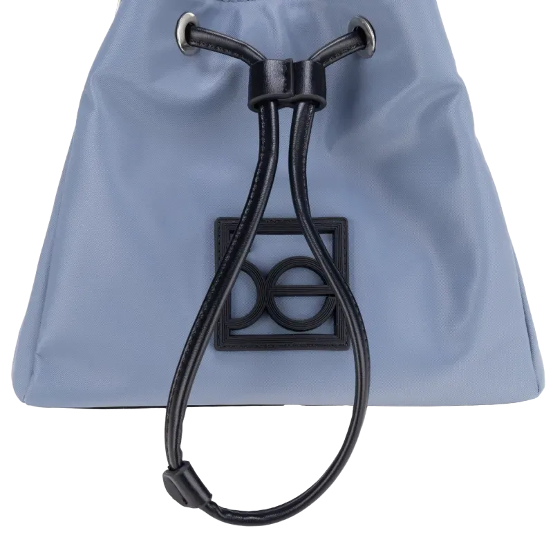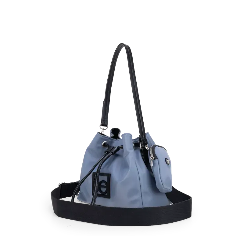 Bolso Drawstring hecho con material textil. Contiene asa larga desprendible. Monedero colgante desprendible. Tiene rubber de monograma.