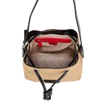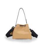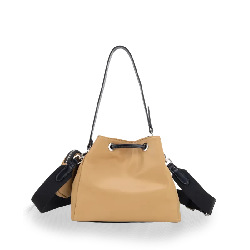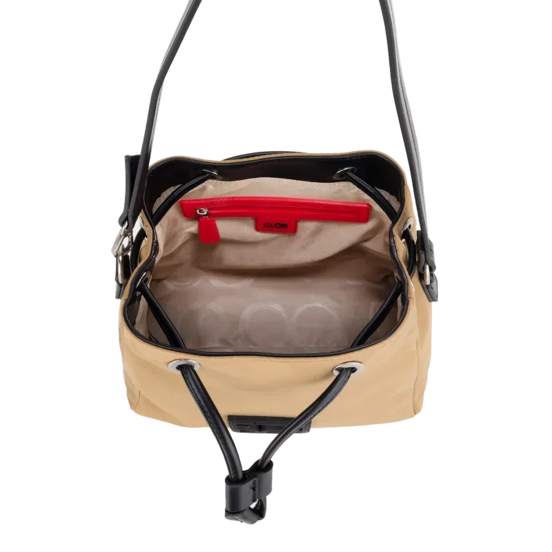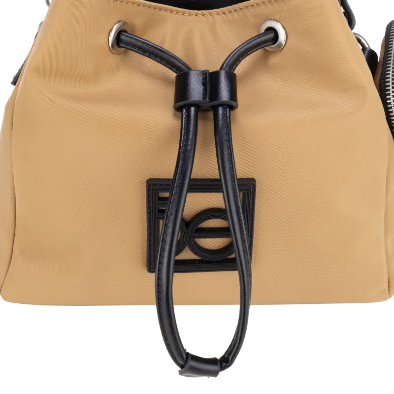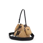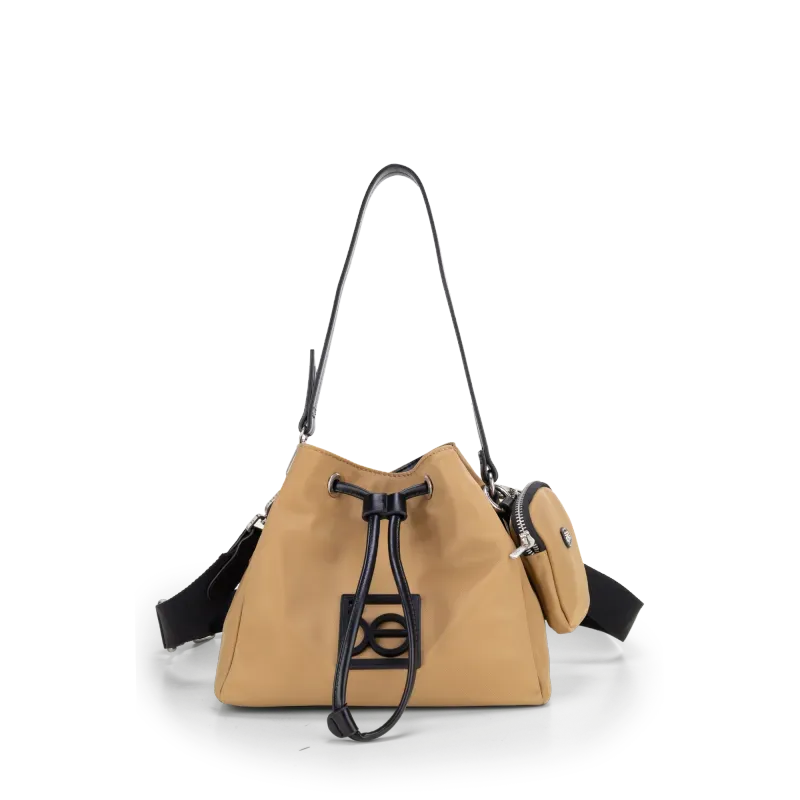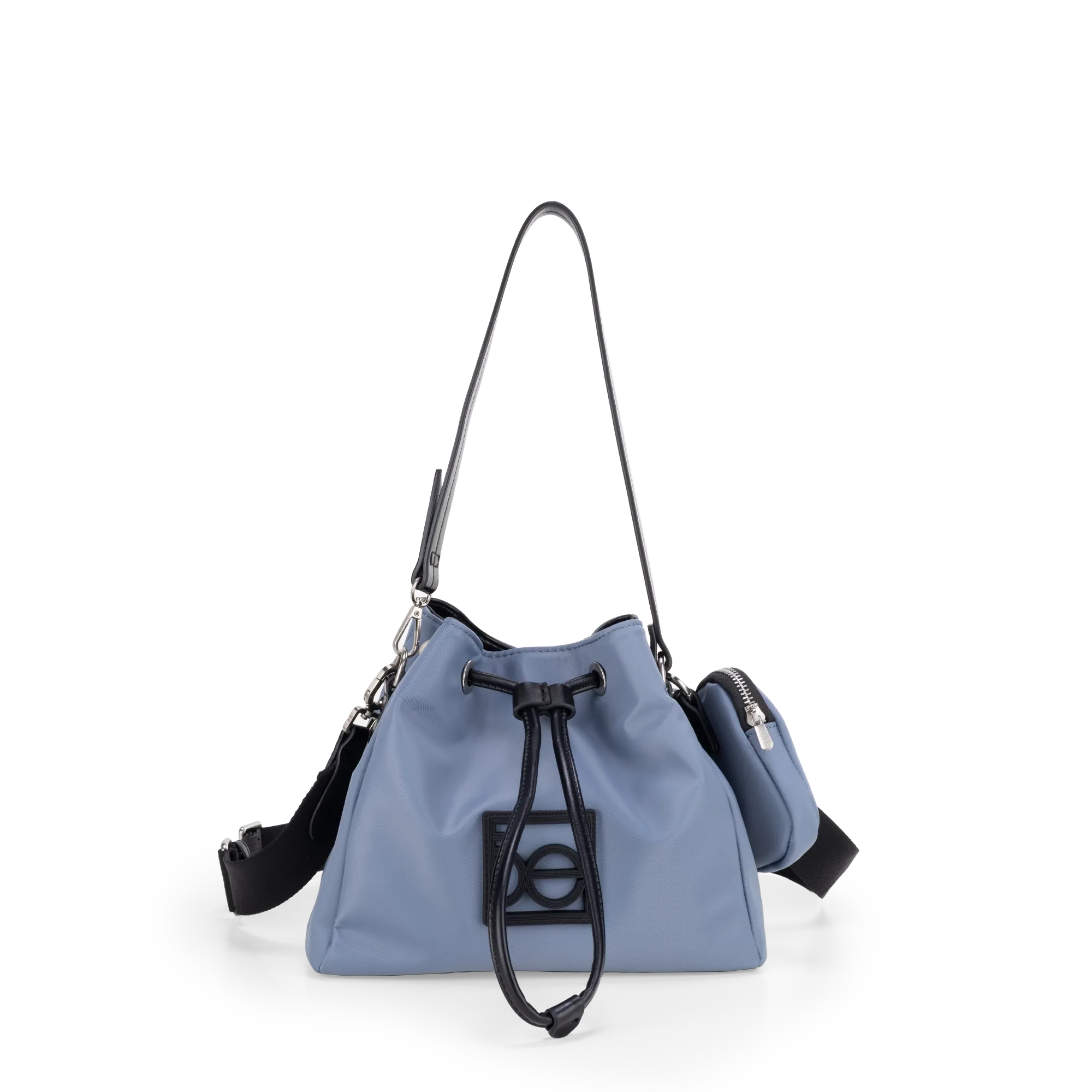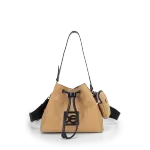 Bolso Drawstring hecho con material textil. Contiene asa larga desprendible. Monedero colgante desprendible. Tiene rubber de monograma.