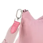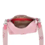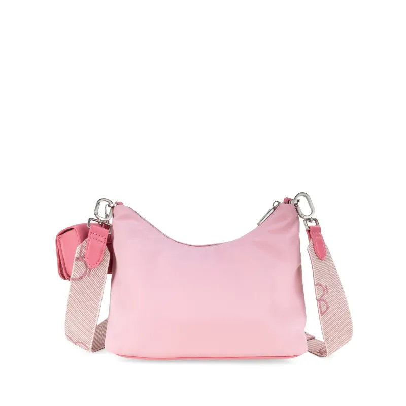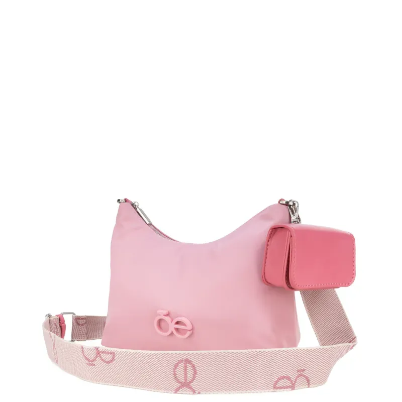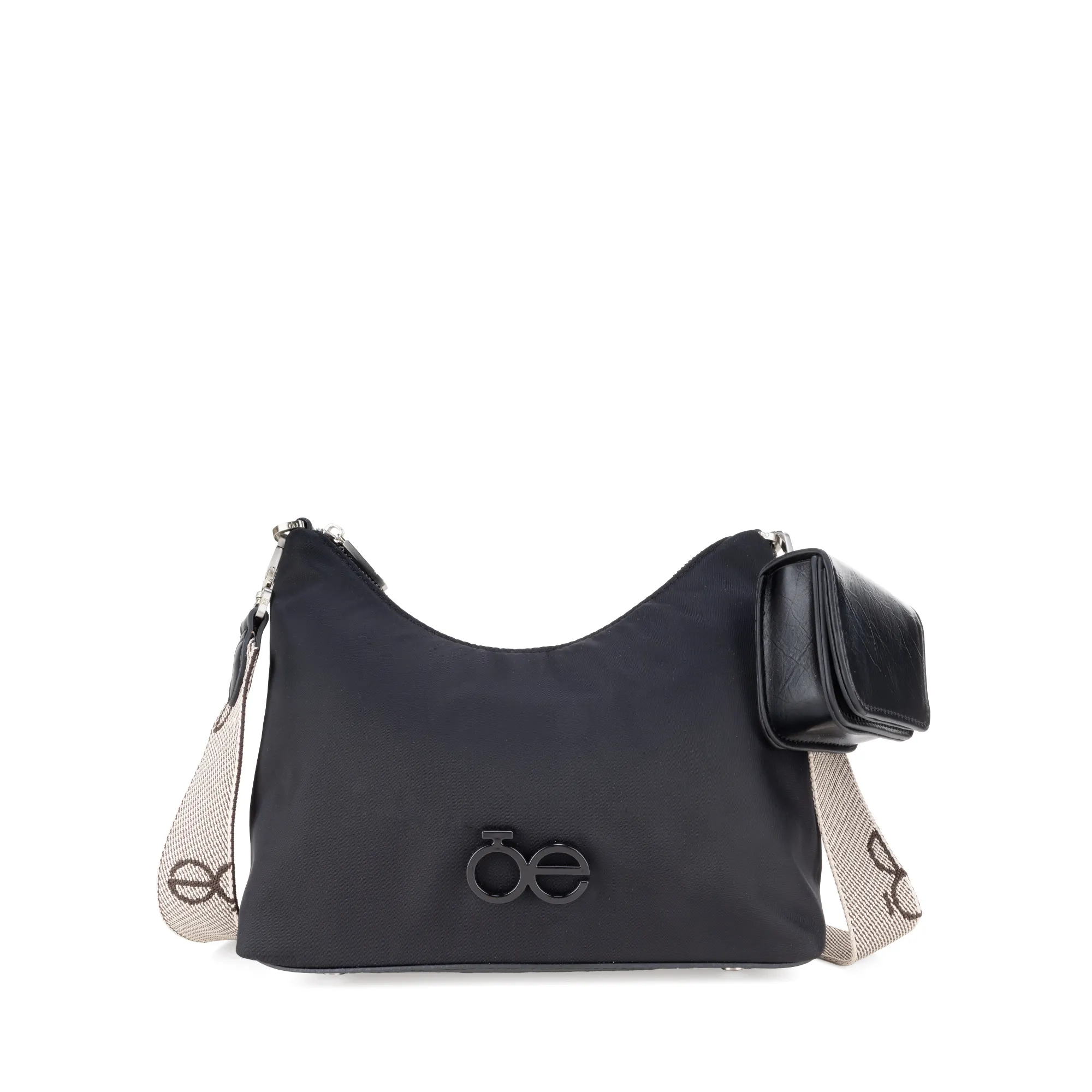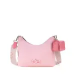 Bolso Hobo hecho con material textil. Incluye monedero desprendible. Asa larja ajustable. Cuenta con herraje metálico de monograma.
