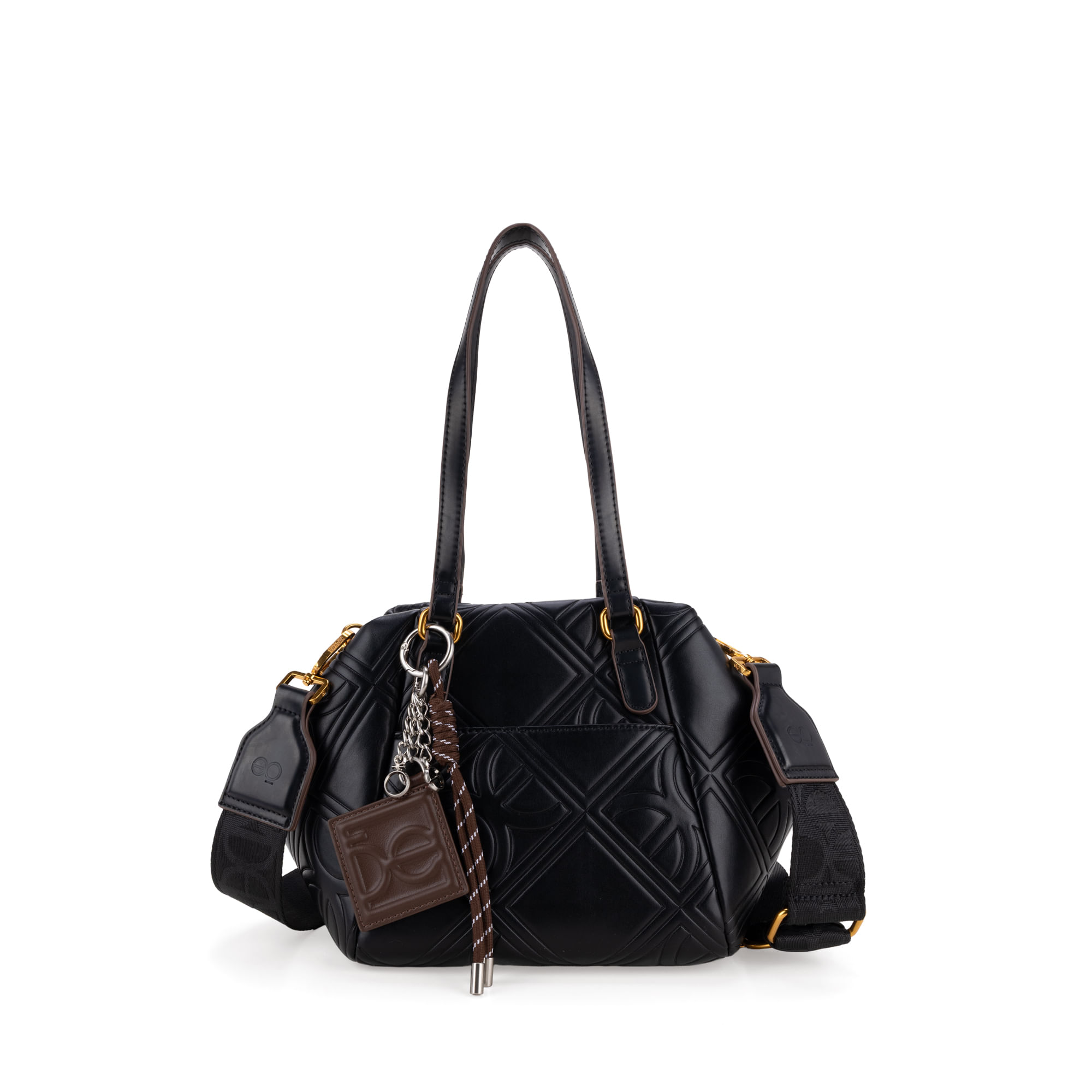 Bolso Satchel hecho con material vegano apariencia piel. Cuenta con bordado de monograma. Tiene cierre metálico de larga duración. Amplia apertura. Incluye Charm desprendible. Asa larga ajustable y removible.