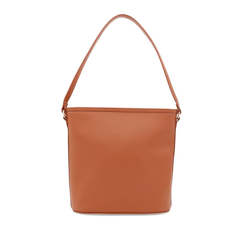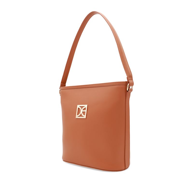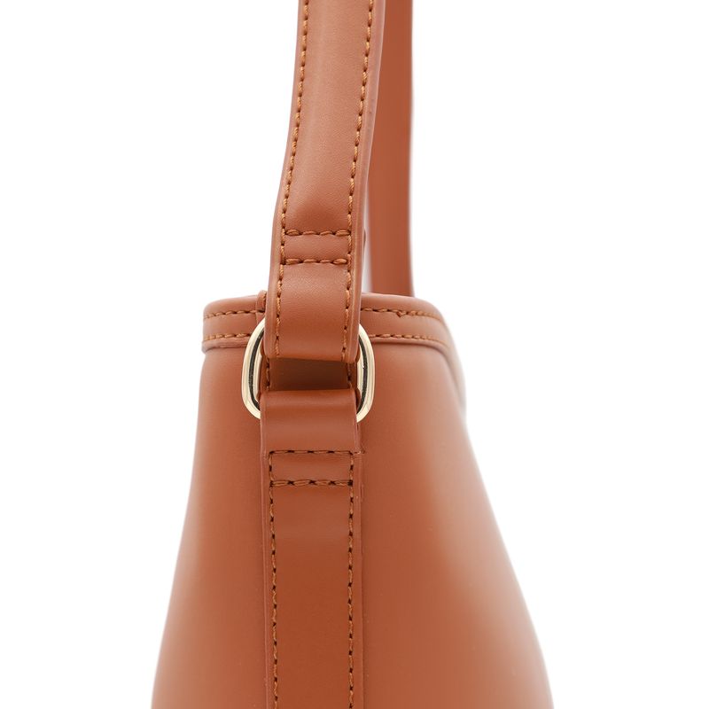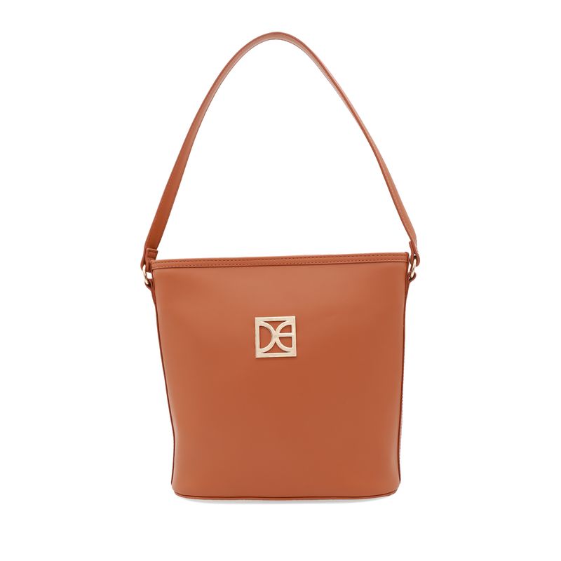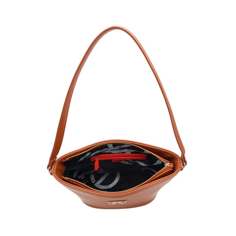 Bolso hecho con material vegano apariencia piel. Cuenta con cierre metálico de larga duración. Herraje de monograma. Asa corta al hombro.