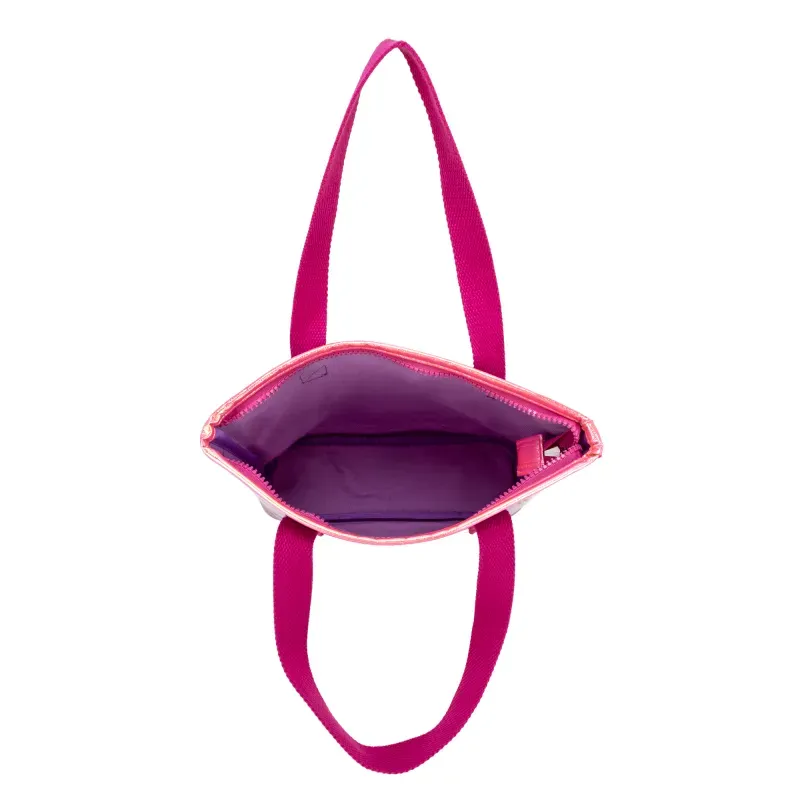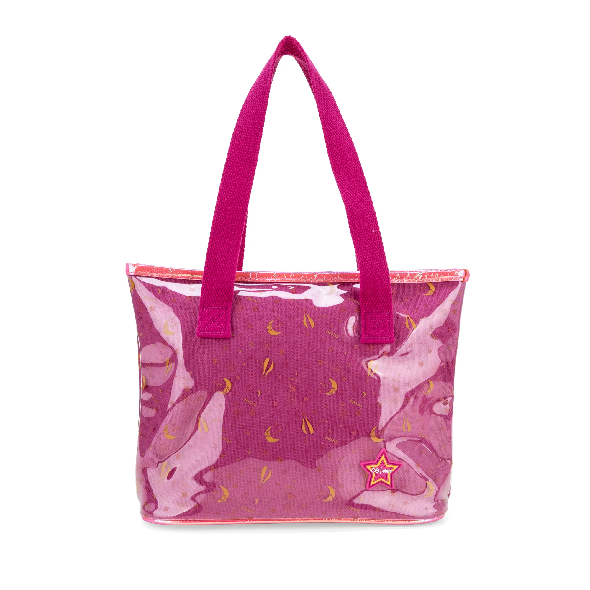 Bolso Tote hecha con material mica. Cuenta con cierre de larga duración. Tiene rubber de logotipo en estrella. Asa larga ajustable.