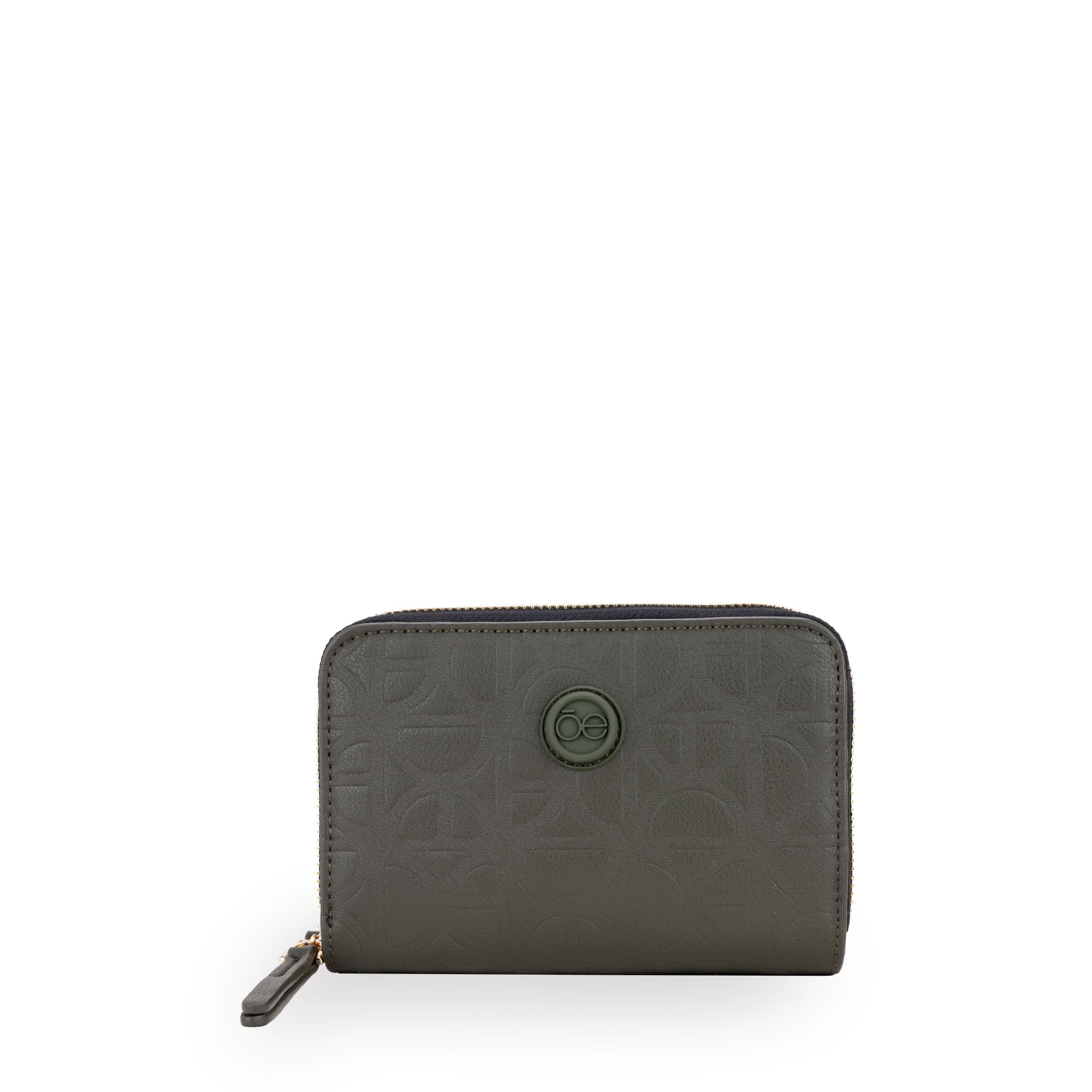 Billetera hecha con material vegano apariencia piel. Cuenta con cierre doble metálico de larga duración. Herraje de monograma. Múltiples compartimentos internos.