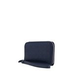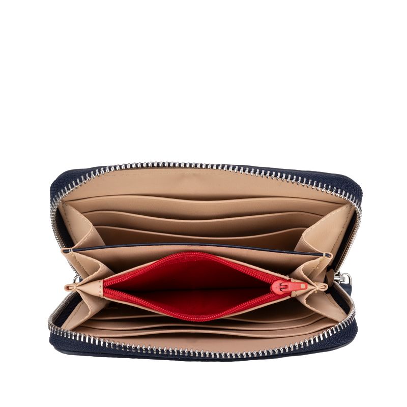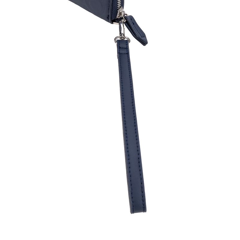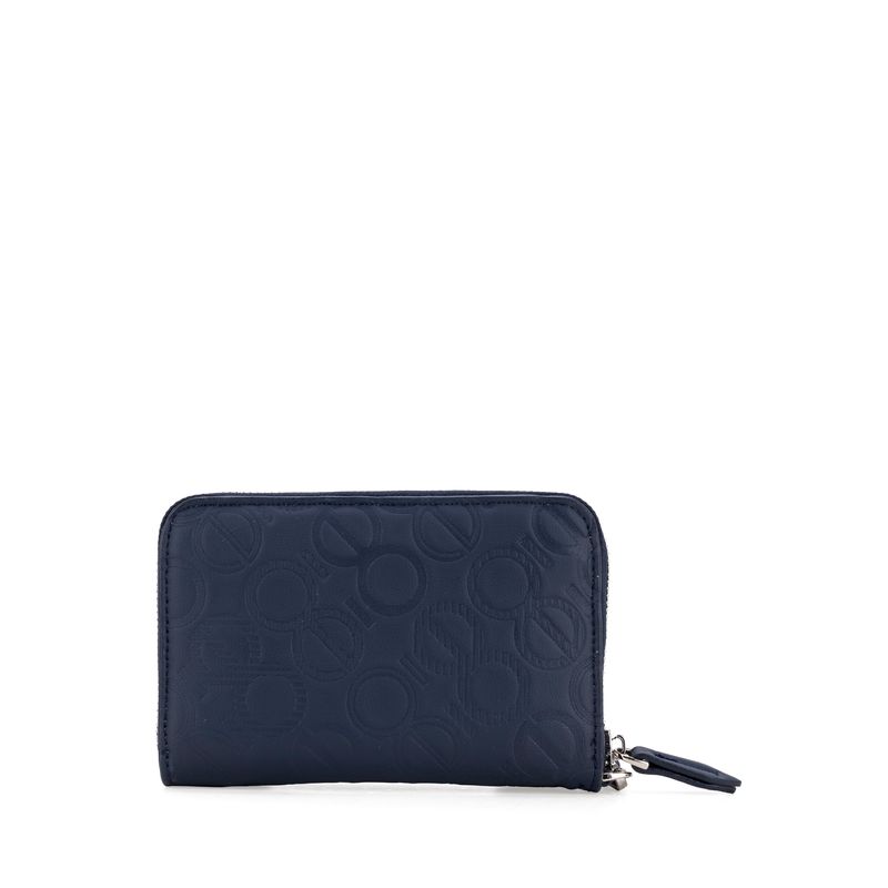 Billetera hecha con material vegano apariencia piel. Diseño de troquelado de monogramas. Cuenta con cierre metálico de larga duración. Incluye maneral de fácil uso. Múltiples compartimentos internos para tarjetas y monedas.