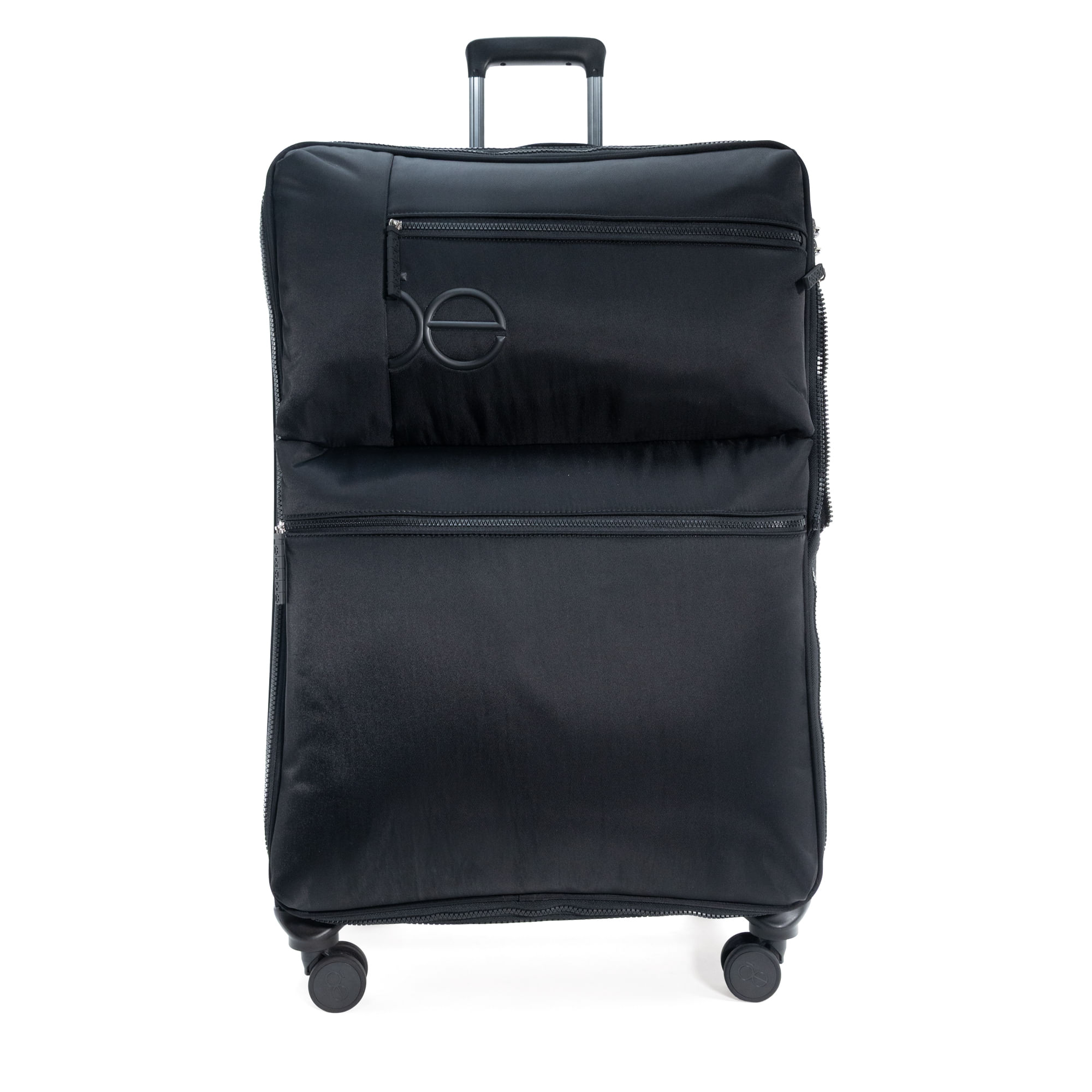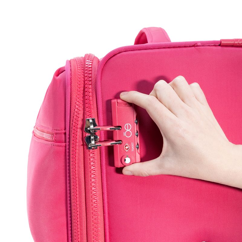 Equipaje hecho con material textil resistente. Cuenta con múltiples compartimentos frontales con cierre. Organizador desprendible. Cosmetiquera impermeable removible. Bastón de tres alturas. Cuatro ruedas dobles y silenciosas, con movimiento 360º. Expandible. Cerradura por combinación TSA. Funda de protección.