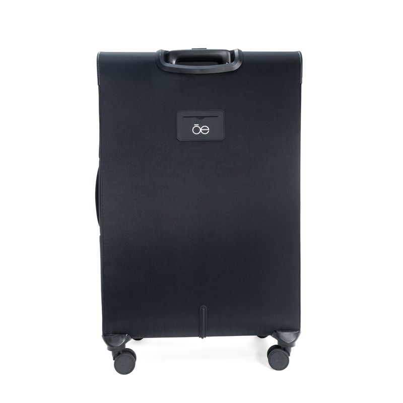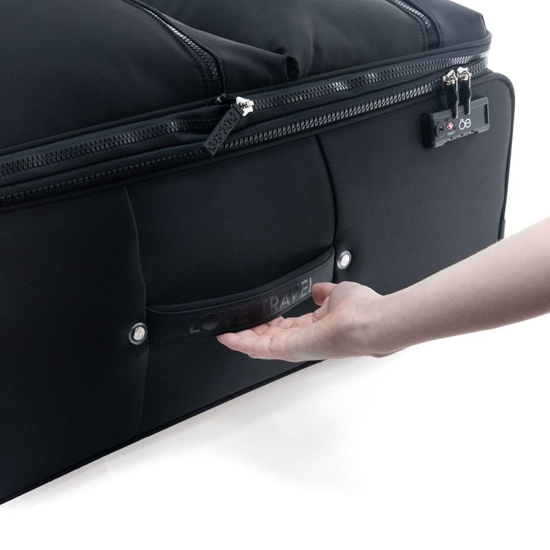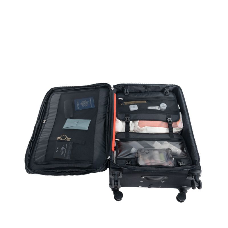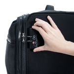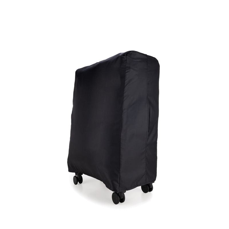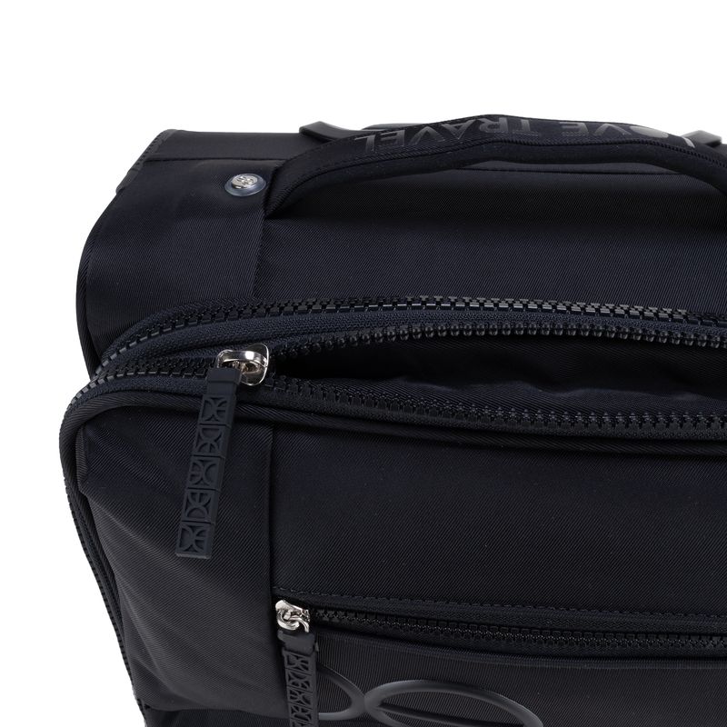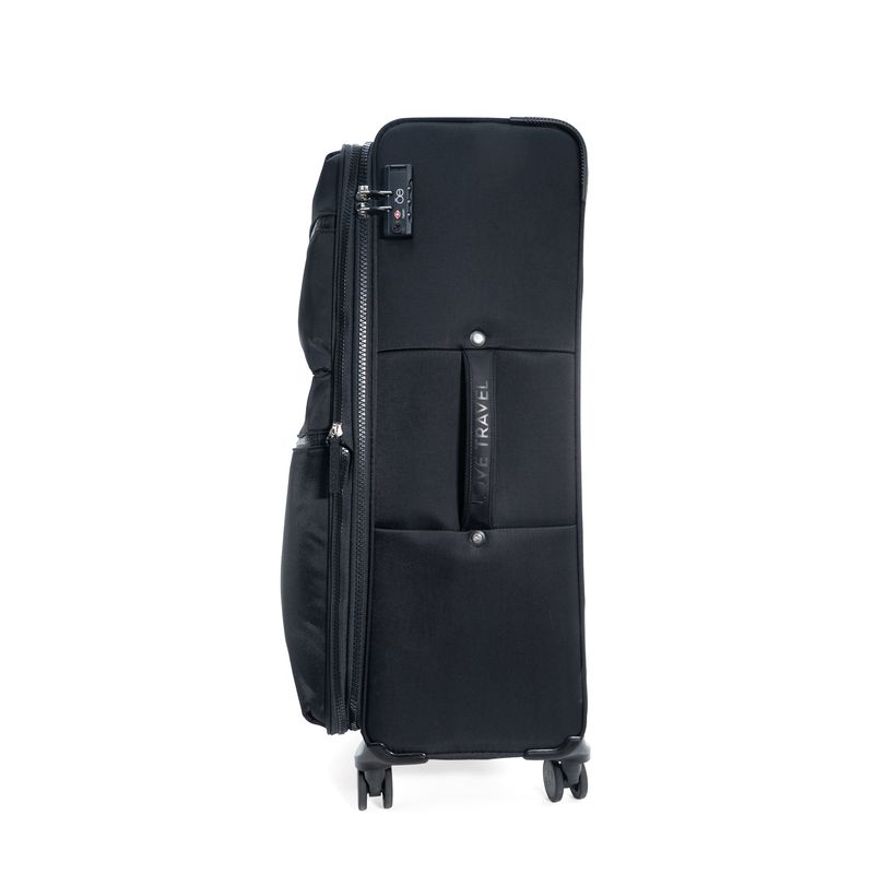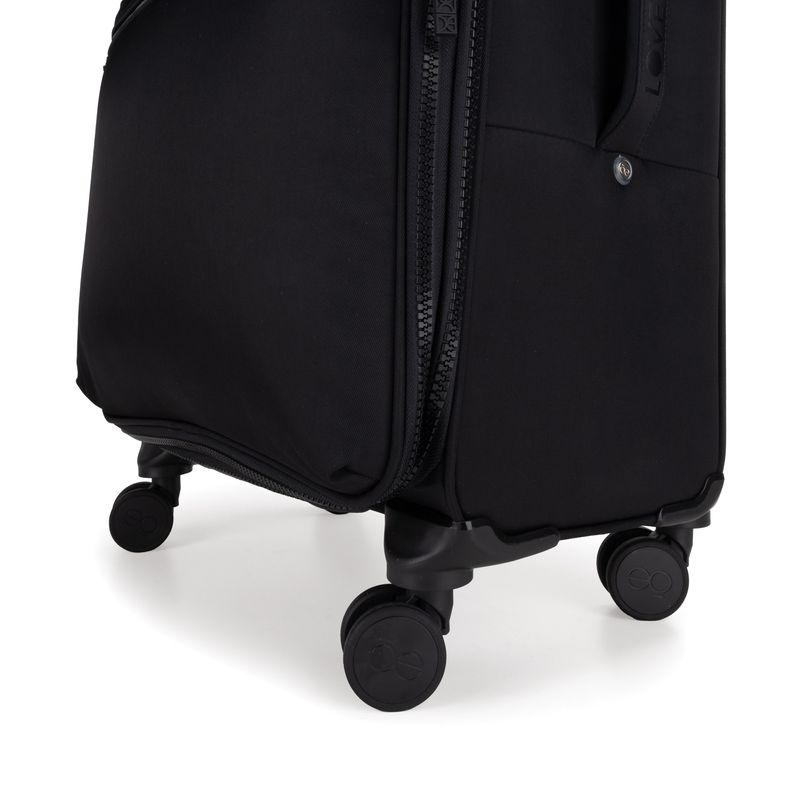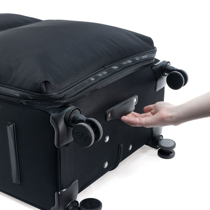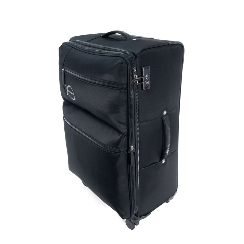 Equipaje hecho con material textil resistente. Cuenta con múltiples compartimentos frontales con cierre. Organizador desprendible. Cosmetiquera impermeable removible. Bastón de tres alturas. Cuatro ruedas dobles y silenciosas, con movimiento 360º. Expandible. Cerradura por combinación TSA. Funda de protección.