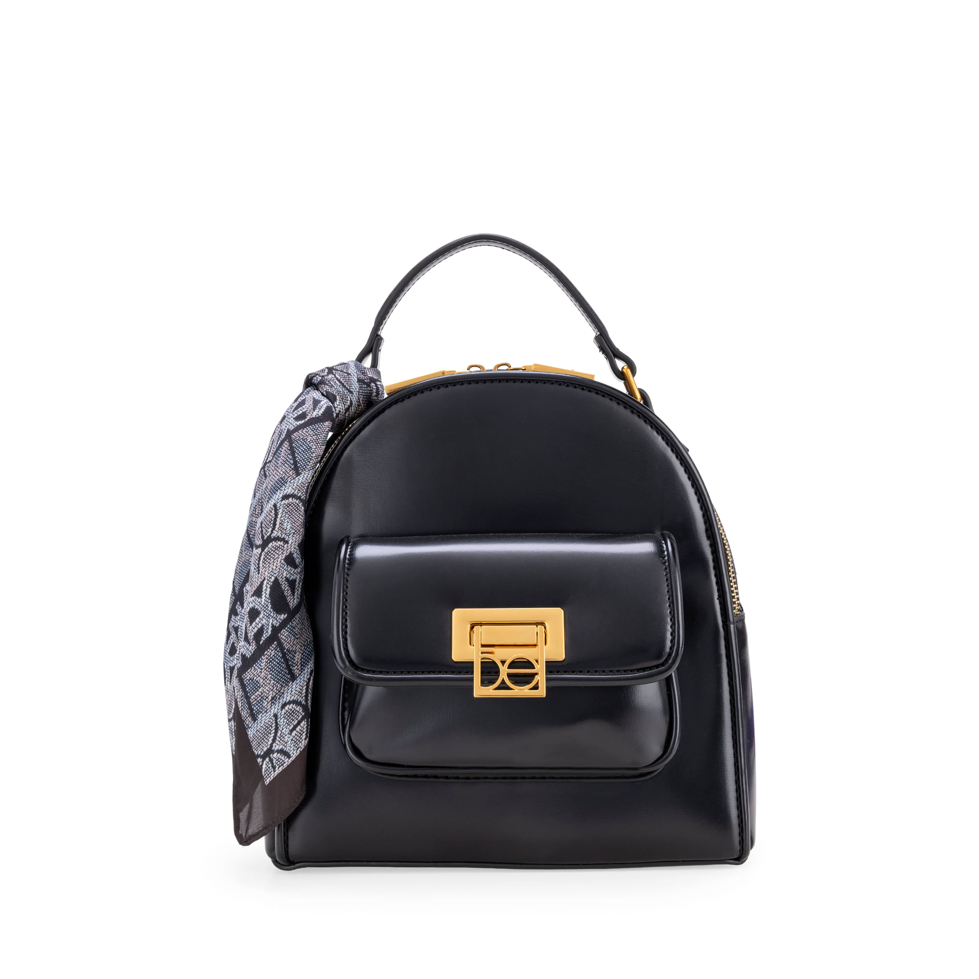 Backpack hecha con material vegano apariencia piel. Cuenta con cierre metálico de larga duración. Tiene compartimento frontal con solapa y broche metálico con detalle de monograma. Incluye mascada multiusos desprendible. Asas traseras ajustables.