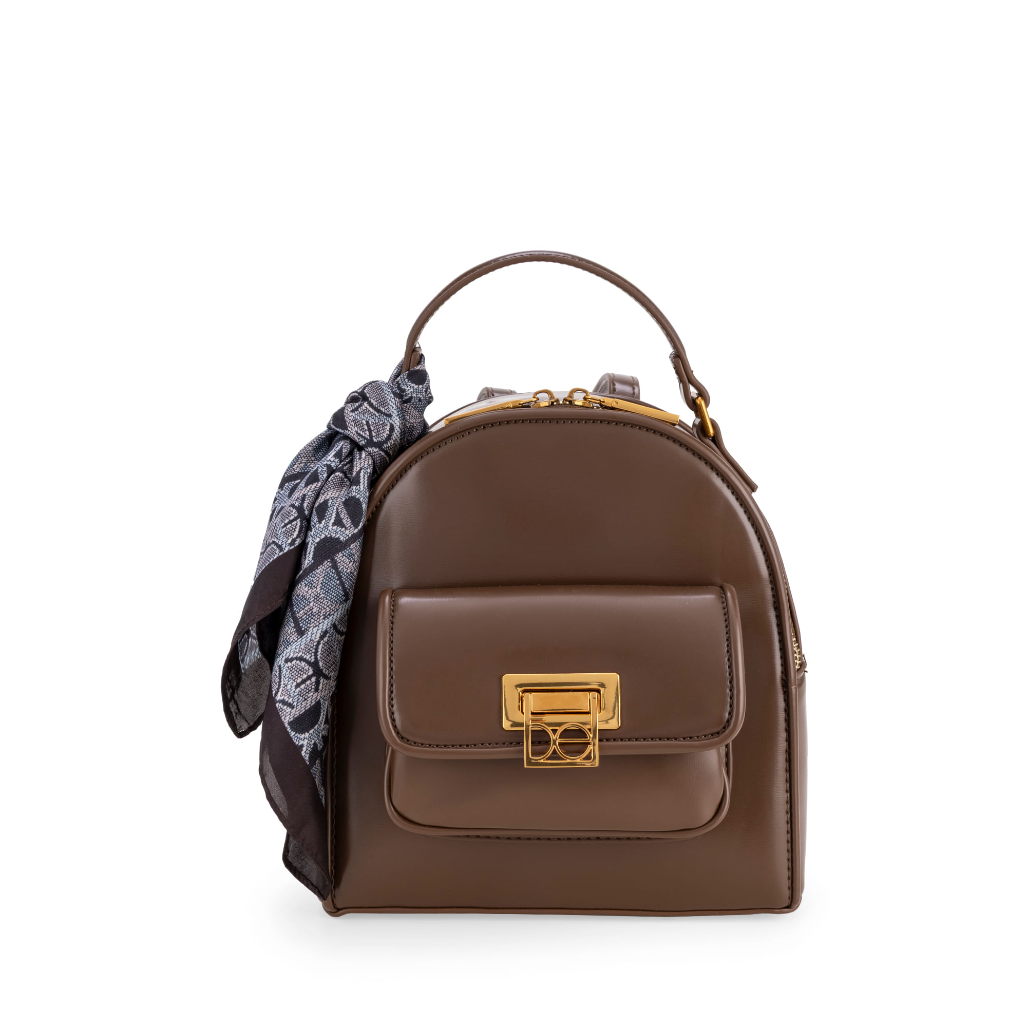 Backpack hecha con material vegano apariencia piel. Cuenta con cierre metálico de larga duración. Tiene compartimento frontal con solapa y broche metálico con detalle de monograma. Incluye mascada multiusos desprendible. Asas traseras ajustables.