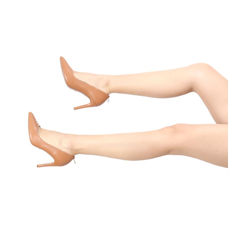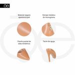 Zapatilla hecha con material vegano apariencia piel. Diseño puntal de alta tendencia. Cuenta con tacón de aguja. Tiene herraje metálico de monograma.